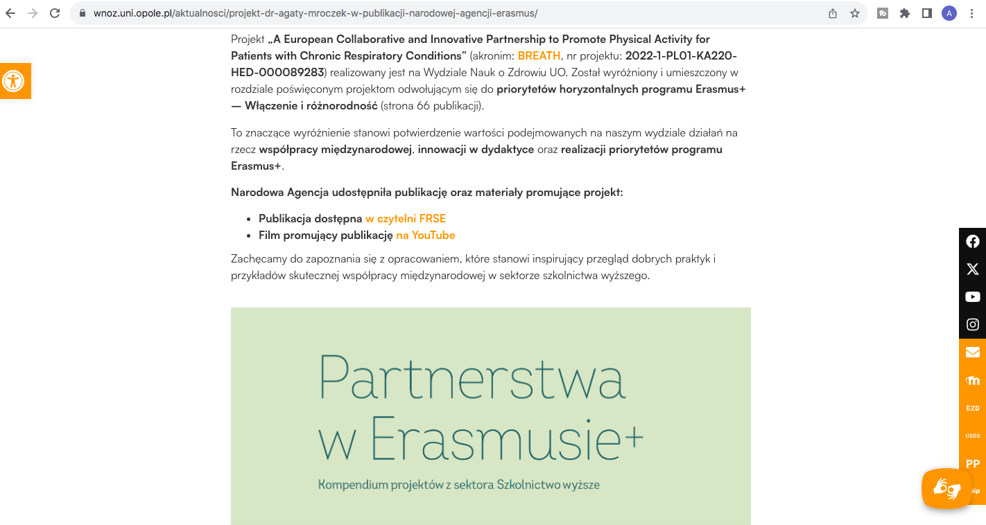 The “Breath” project was featured in the latest publication of the National Agency of the Erasmus+ Programme and the European Solidarity Corps, titled “Partnerships in Erasmus+. A Compendium of Projects from the Higher Education Sector.” “Breath” stands for “A European Collaborative and Innovative Partnership to Promote Physical Activity for Patients with Chronic Respiratory Conditions” (project no. 2022-1-PL01-KA220-HED-000089283). The project, implemented at the Faculty of Health Sciences, aimed to examine the impact of physical activity on the treatment of chronic respiratory diseases.