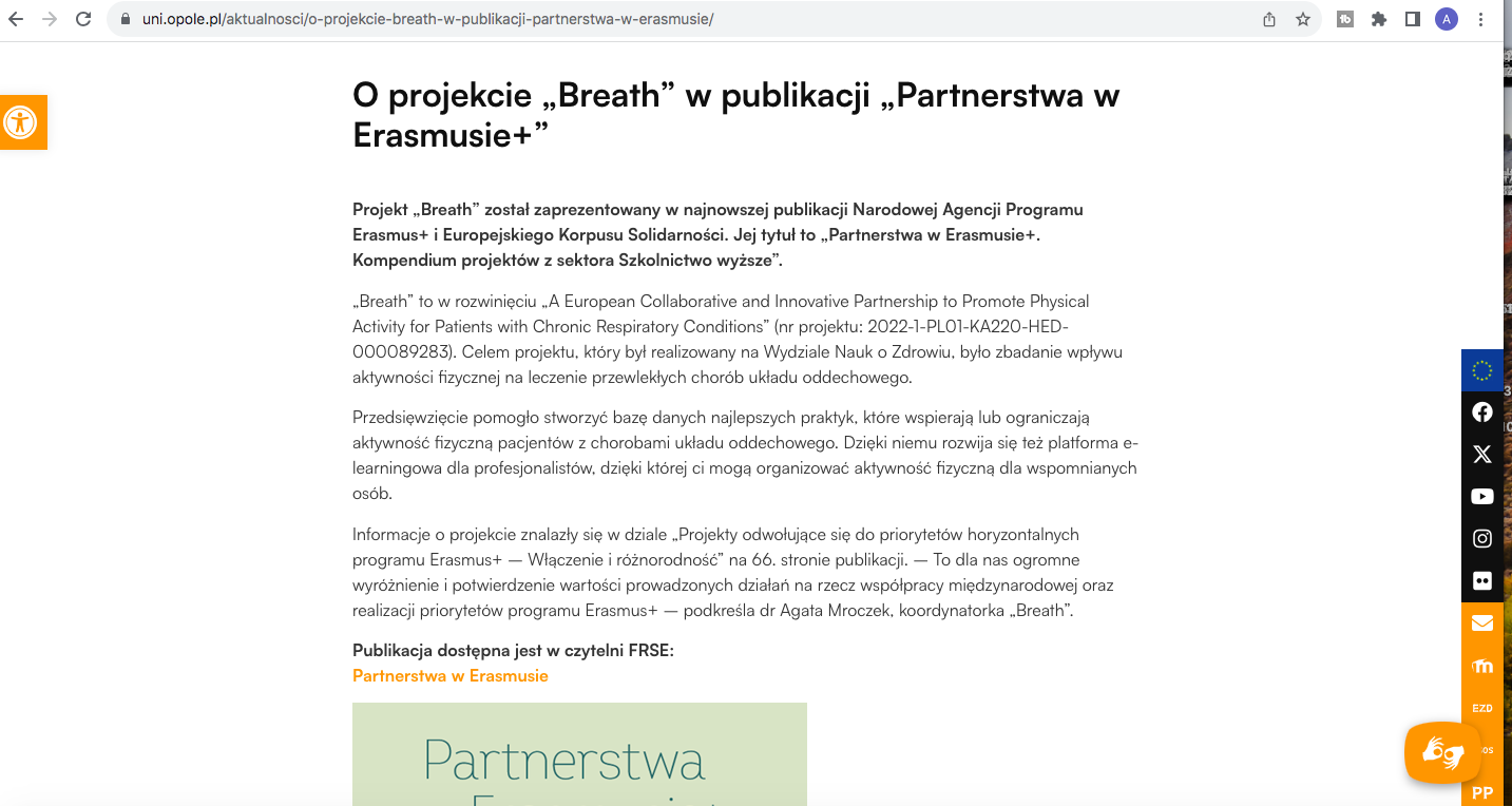 The BREATH project team is delighted to announce that their work has been featured in the latest publication by the Polish National Agency of the Erasmus+ Programme and the European Solidarity Corps, titled “Partnerships in Erasmus+. A Compendium of Projects from the Higher Education Sector.”
