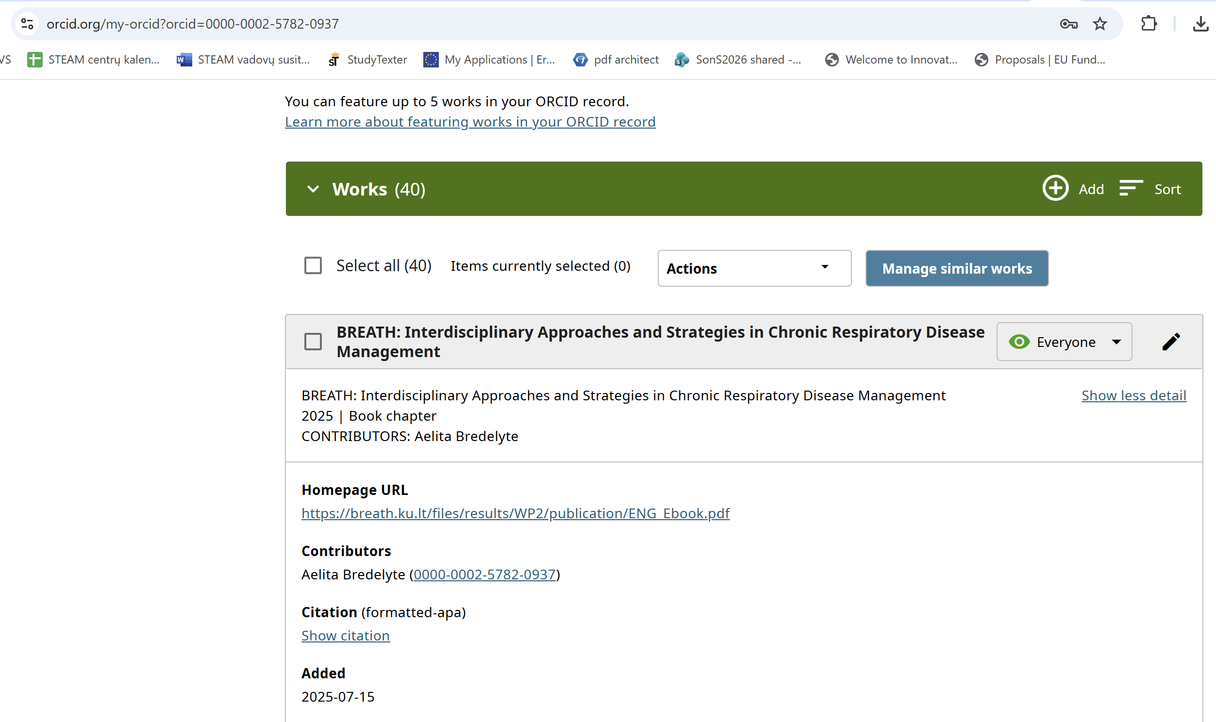Klaipėda University supports the sustainability and long-term visibility of the BREATH project by ensuring that its researchers actively share the project’s Exchange publication through their ORCID ID profiles. By uploading and linking the publication directly in ORCID, the researchers make the project results permanently accessible to the international academic community and to all users who rely on ORCID for verified scholarly information. These profiles are regularly consulted by collaborators, students, reviewers, funding agencies and institutional partners, which significantly increases the reach of the BREATH outputs. Through this practice, the publication becomes visible not only within the university but also to researchers from universities, healthcare organisations, professional associations and policy institutions worldwide.