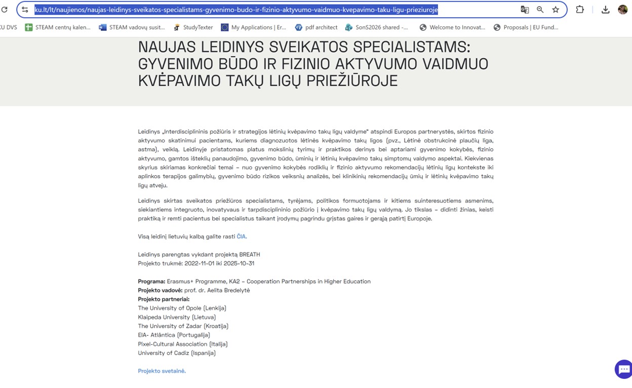 Klaipeda University also contributes to the sustainability and long-term visibility of the BREATH project by publishing information about the project’s e-book on the university’s official portal. The dedicated article presents the publication to a broad audience of students, lecturers, researchers, healthcare professionals and community members who regularly follow the university’s updates. By hosting the announcement on an institutional platform with high credibility and stable traffic, the university ensures that the BREATH results remain accessible and discoverable well beyond the project’s completion. The article provides a direct link to the publication, enabling readers to explore the e-book and apply its insights in academic, clinical and professional contexts. This communication strategy not only enhances dissemination within the university but also strengthens the project’s reach across regional and national networks, supporting continued engagement with the project’s outcomes and encouraging their integration into teaching, research and health-related practice.