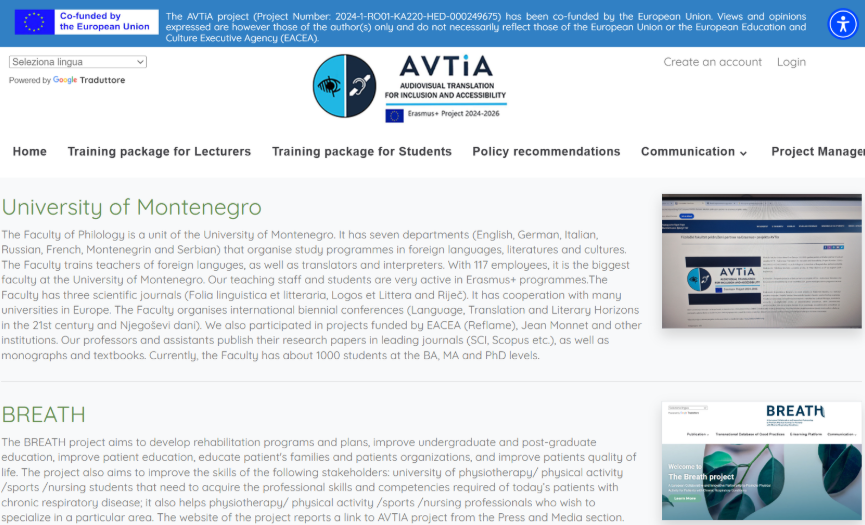 The AVTIA project aims to develop new innovative content that provides lecturers in Higher Education Institutions (HEIs) with knowledge and materials in the form of open online courseware (OPC) to teach and assess inclusion in audiovisual translation/subtitling for the deaf and hard of hearing, and audio description for the blind and partially sighted; build and consolidate the required knowledge and skills of university students (including freelance translators) specializing in audiovisual translation through autonomous learning, preparing them for current labor market needs; generate attitude change and raise awareness among HEIs and stakeholders regarding the disparity in the range of inclusion services provided in different EU member states and the obligation to ensure access to public information for people with disabilities within national legislation.The website of the project reports a link to the BREATH project from the Press and Media section