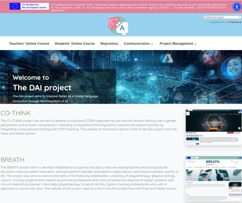 The DAI project has the aim to improve Italian as a foreign language instruction through the integration of AI. Its core objectives are to provide students with a personalized, AI-based training package; equip teachers with the digital and AI skills needed for effective integration of these technologies; offer a comprehensive resource library for both teachers and learners, gather a learner corpus from the online course for research purposes.This initiative seeks to transform teaching practices by leveraging AI's potential for tailored education. The website of the project reports a link to the BREATH project from the Press and Media section