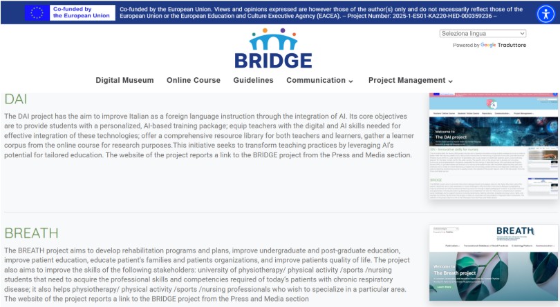 The BRIDGE project aims to promote intercultural dialogue based on European values in the Higher Education sector.The specific objectives are to raise awareness on social challenges in HEIs that affect intercultural dialogue by highlighting inspiring practices and offering interactive teaching resources through a digital pedagogical museum, to provide innovative and specialized university education by developing microcredentials that train for intercultural competencies to address social challenges and to support Inclusive University Governance, helping institutions integrate diversity, human rights, and equality into policies. By the end of the project, at least six universities will have piloted or integrated these frameworks. The website of the project reports a link to the BREATH project from the Press and Media section