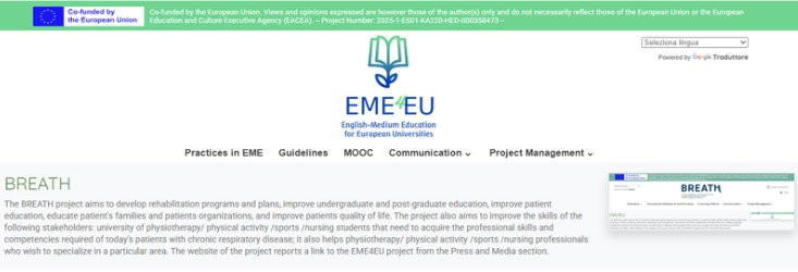 The EME4EU project has the aim to transform European Higher Education by empowering institutions to implement high-quality English Medium Education programs. It aims to enhance universities’ capacities, improve legislative frameworks, and foster collaboration among institutions, creating a globally competitive and inclusive education system. By addressing challenges like language barriers and resource gaps, the project promotes accessibility, innovation, and labor market alignment.The website of the project reports a link to the BREATH project from the Press and Media section